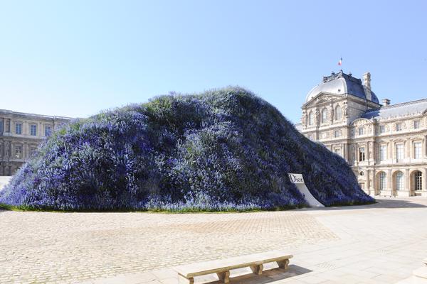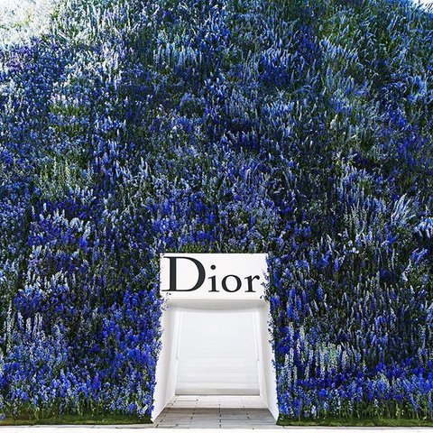 Lets start by talking about Dior’s venue because it itself was a whimsical fairytale. Located in the center of the historical Louvre’s Cour Carrée Dior created a man-made hill covered in 400,000 delphiniums for its show.
